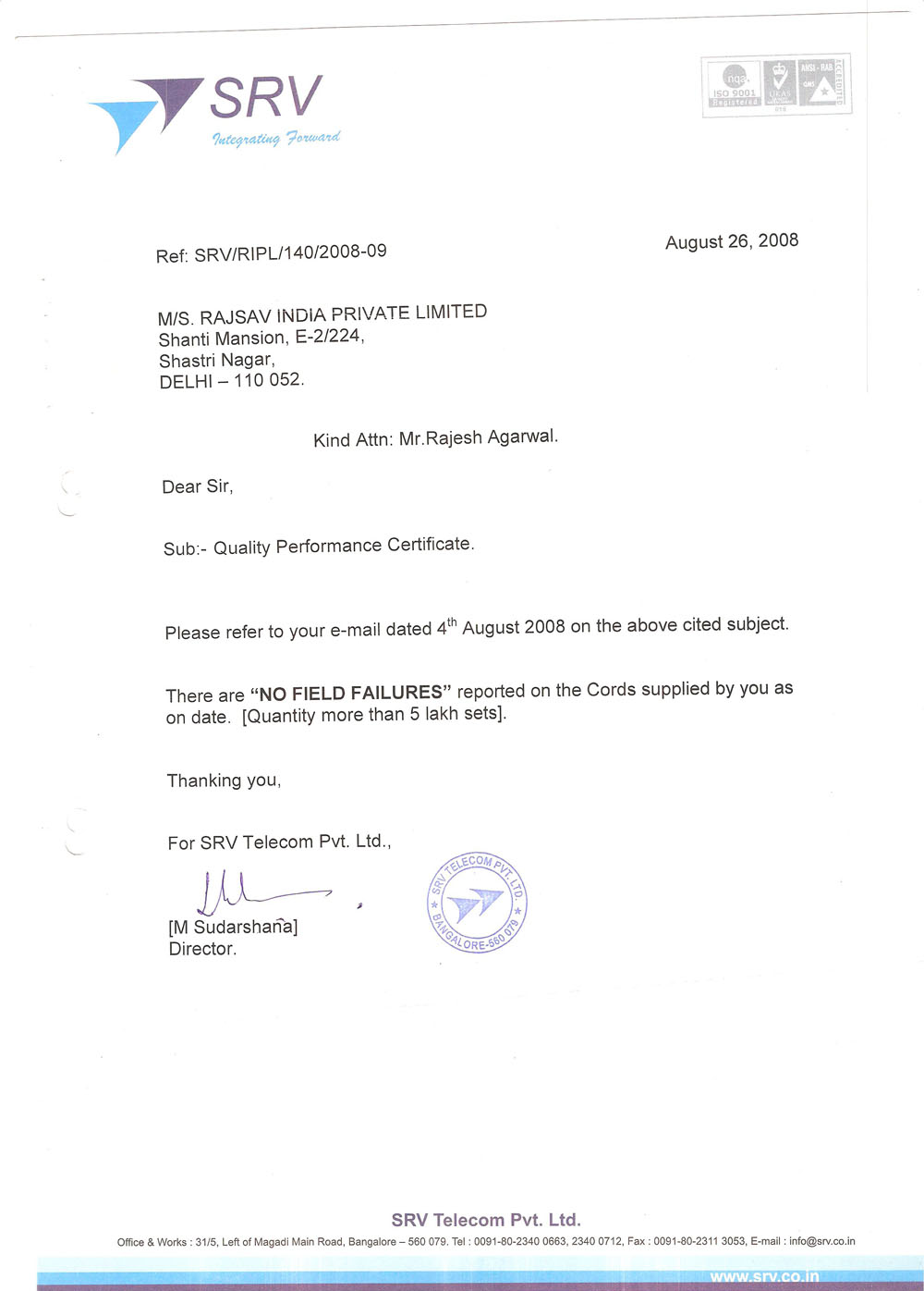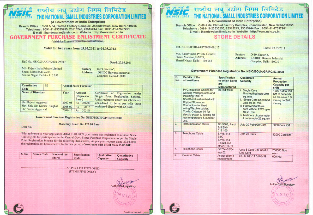 Rajsav India Private Limited has been certified by BSNL, BIS, ISO and ITI ‘s for the manufacturing of cables & cords. We have the certification from: